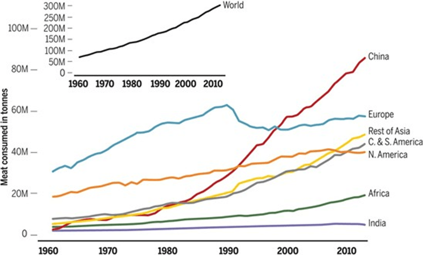 The meat production is largely associated with greenhouse gas (GHG) emission which emits 14.5 % of total GHG globally. Cattle has the highest GHG emission followed by pig production and milk production. There are 44% GHG from methane (CH4), 29 % Nitrous oxide (NO2) and 27% carbon dioxide (CO2), statistics from FAO. The increasing demand for meat requires more land leads to severe deforestation. The Brazilian amazon, one of the victims of beef production has greatly deforested for more pastureland and more crops to feed the livestock (Vale, 2019). The problem with livestock production is it not only consumes a large amount of water (cattle farming and the crop-feed irrigation used the most amount of water) but also the water body is contaminated by the untreated manure (Godfray et al., 2018). There are 98 % of total water usage in meat production for livestock feed. The untreated manure from factory farming contains pathogens and toxins carried through the water bodies further contaminating the crops for humans. Since there is more land conversion to agriculture, the biodiversity is decreasing as farmers prefer to only grow cash-crop (Bittman, 2021). The consequence leads to soil erosion and unfair food trade. Other than what happened on land, in aquaculture, overfishing in the ocean to meet the demand has endangered the fish population, which plays an important role in ecosystem balance (Gordan et al., 2018). The ocean acidification may return consequence for the land. Last but not least, it is commonly known that the factory farming animals are treated unethically, and where the antibiotic was used to prevent disease. Traditional farming (so called organic farming) is more ethical but requires more land and labour countercurrent with the growth-based economic food system. The antibiotic could be more serious than climate change as the COVID-19 pandemic happened in 2019 allegedly from (wild) animals. The mutation of bacteria and viruses could wipe out species easily. In summary, meat production has a serious impact on the environmental issue especially the GHG emission to climate change.