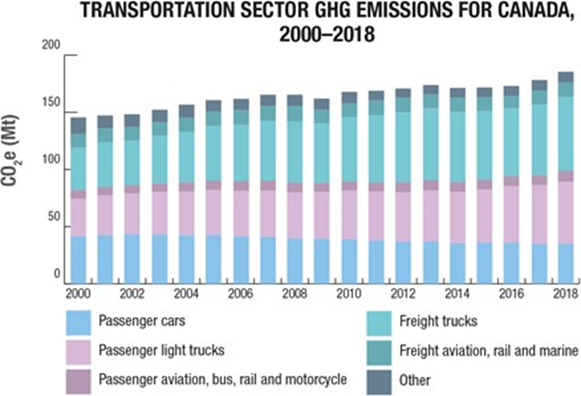 The transportation sector is currently responsible for 23% of Canada’s greenhouse gas emissions. These greenhouse gas emissions primarily come from the burning of fossil fuels for our cars, trucks, trains, buses, planes, and ships. Over 90% of the fuel used for transportation is petroleum based, which includes primarily gasoline and diesel. In Canada, approximately 15.4 million people regularly commute every day, with an estimate of 12% using public transit to be their primary mode of travel. Over 12 million people choose to drive their cars to work which accounts for 74% of people, while another 5.4% ride as passengers.